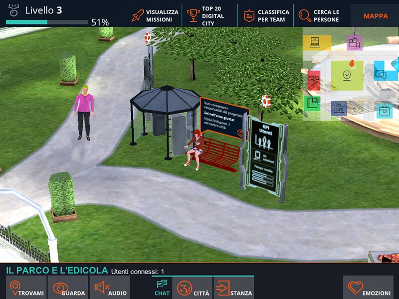Focus Personalizzazione, per ogni utente, del proprio avatar. Esperienza di vita virtuale in ambito urbano in relazione con i propri colleghi.